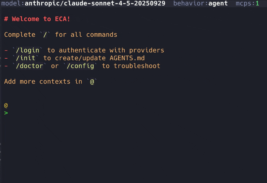 /init: Create/update the AGENTS.md file with details about the workspace for best LLM output quality./login: Log into a provider. Ex:github-copilot,anthropic./compact: Compact/summarize conversation helping reduce context window./resume: Resume a chat from previous session of this workspace folder./costs: Show costs about current session./config: Show ECA config for troubleshooting./doctor: Show information about ECA, useful for troubleshooting./repo-map-show: Show the current repoMap context of the session./prompt-show: Show the final prompt sent to LLM with all contexts and ECA details.