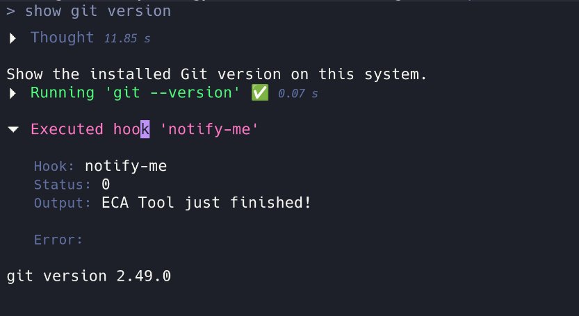 Besides the built-in native tools, ECA allows you to define your own tools by wrapping any command-line executable. This feature enables you to extend ECA's capabilities to match your specific workflows, such as running custom scripts, interacting with internal services, or using your favorite CLI tools.