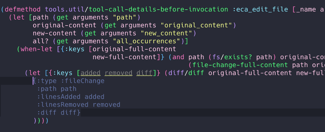 eca_directory_tree: list a directory as a tree (can be recursive).eca_read_file: read a file content.eca_write_file: write content to a new file.eca_edit_file: replace lines of a file with a new content.eca_preview_edit_file: Only used in plan mode, showing what changes will happen after user decides to execute the plan.eca_move_file: move/rename a file.eca_grep: ripgrep/grep for paths with specified content.