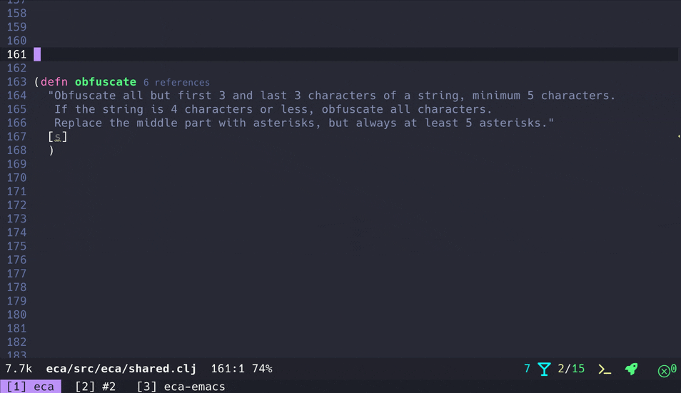 Chat is the main feature of ECA, allowing user to talk with LLM to behave like an agent, making changes using tools or just planning changes and next steps.