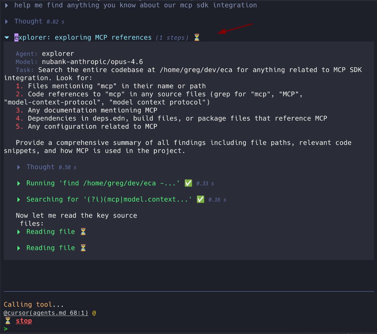 ECA leverage tools to give more power to the LLM, this is the best way to make LLMs have more context about your codebase and behave like an agent. It supports both MCP server tools + ECA native tools.